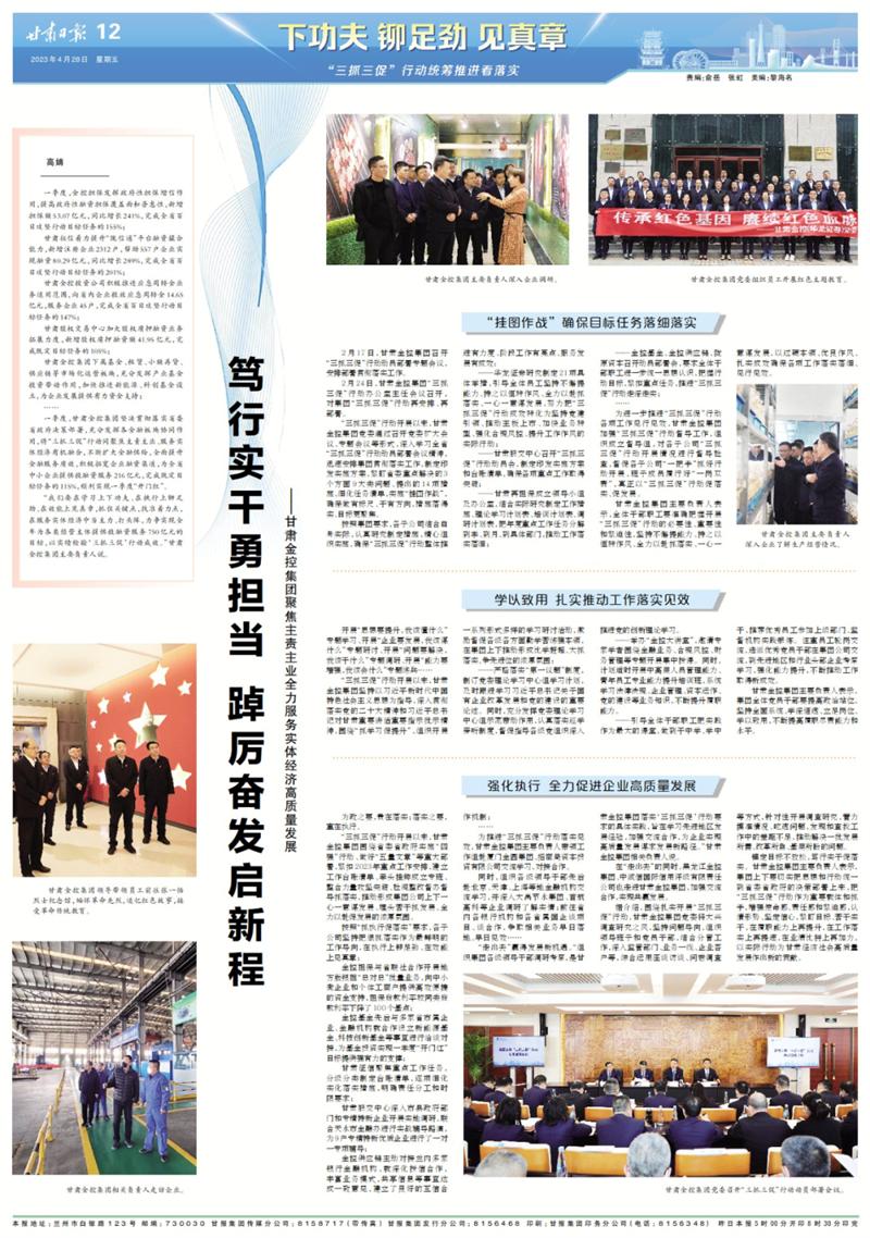 “三抓三促”行動開展以來,甘肅金控集團圍繞省委省政府實施“四強”行動、做好“五量文章”等重大部署,緊扣2023年重點工作安排,建立工作臺賬清單、牽頭掛帥成立專班、整合力量攻堅突破、檢視整改督辦督導抓落實,推動形成集團公司上下一心一意謀發(fā)展、埋頭苦干抓發(fā)展、全力以赴促發(fā)展的濃厚氛圍。