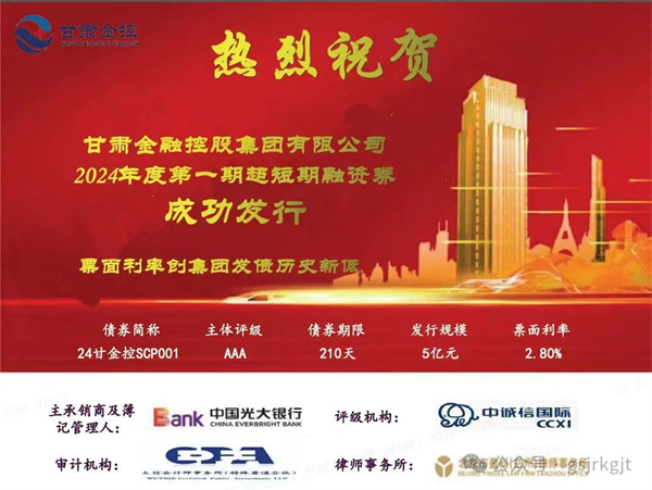 1月26日,甘肅金控集團成功發(fā)行2024年度第一期超短期融資券,發(fā)行規(guī)模5億元,債券期限210天,票面利率2.80%,再創(chuàng)發(fā)行債券融資利率新低。