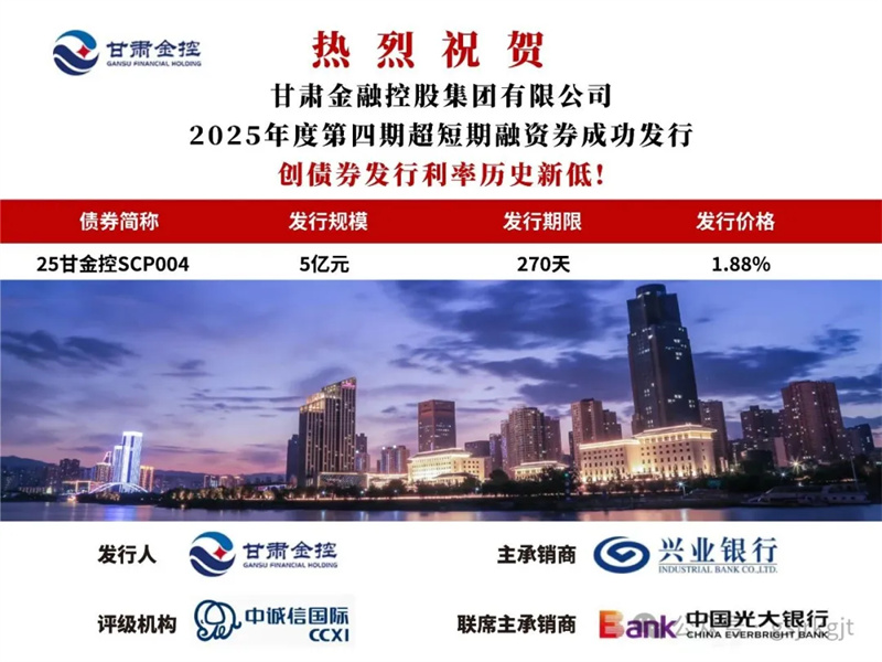 2025年6月26日,甘肅金控集團成功發行2025年度第四期超短期融資券“25甘金控SCP004”,規模5億元,期限270日,票面利率1.88%,創集團債券發行利率歷史新低,有助于集團降低融資成本。