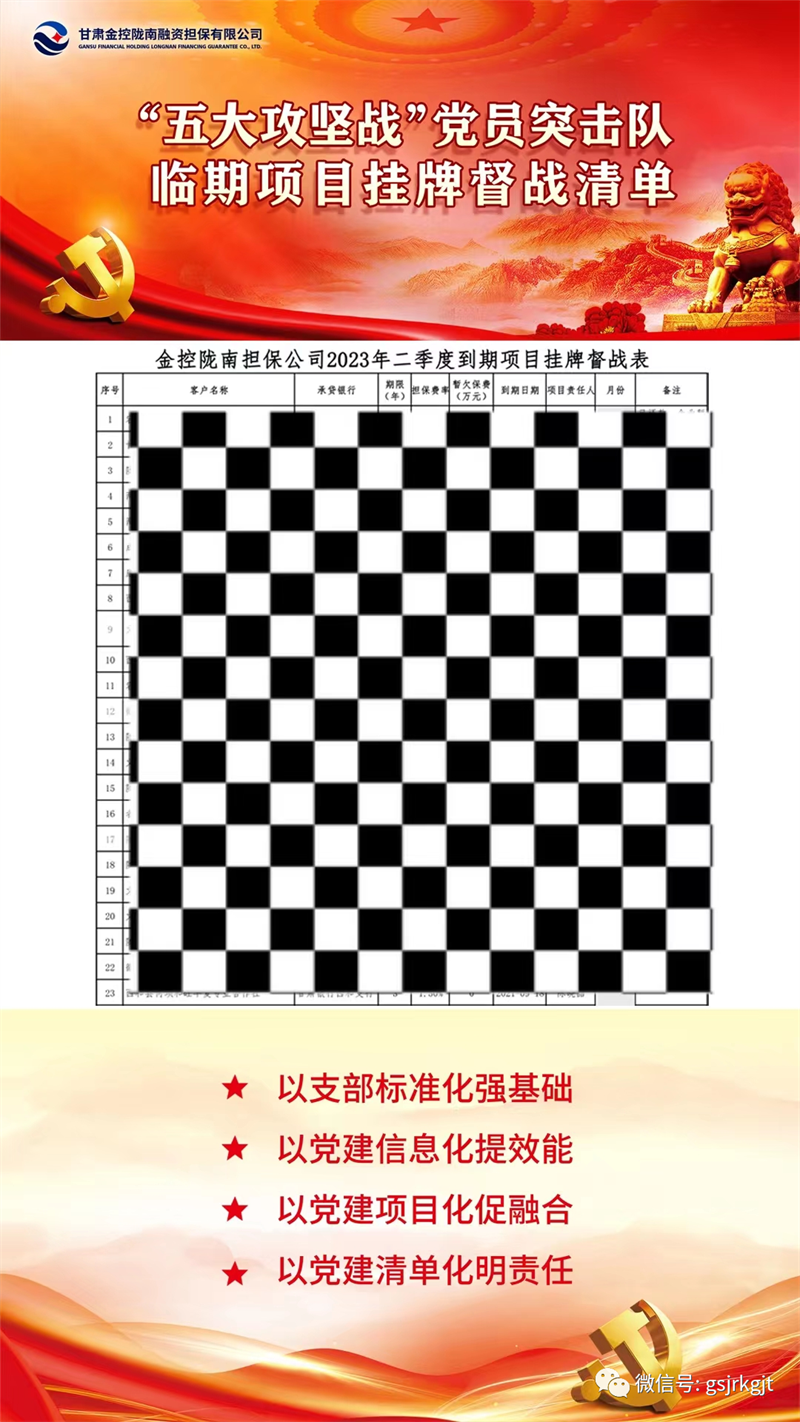 為扎實推進“三抓三促”行動,全面落實集團黨委黨建標準化、信息化、項目化、清單化建設要求,以高質量黨建引領高質量發展,金控隴南擔保創新“1+2+5”工作模式,全面打響黨建項目化攻堅戰。